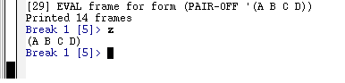 テキストで説明されているように,バックトレースは LISP が行った処理の一覧が表示されます.行われた処理の順序は, この一覧の下から上です.すなわち,EVAL frame for form (pair-off '(a b c d)) が最初です.これは (pair-off '(a b c d)) が 評価されたという意味です.