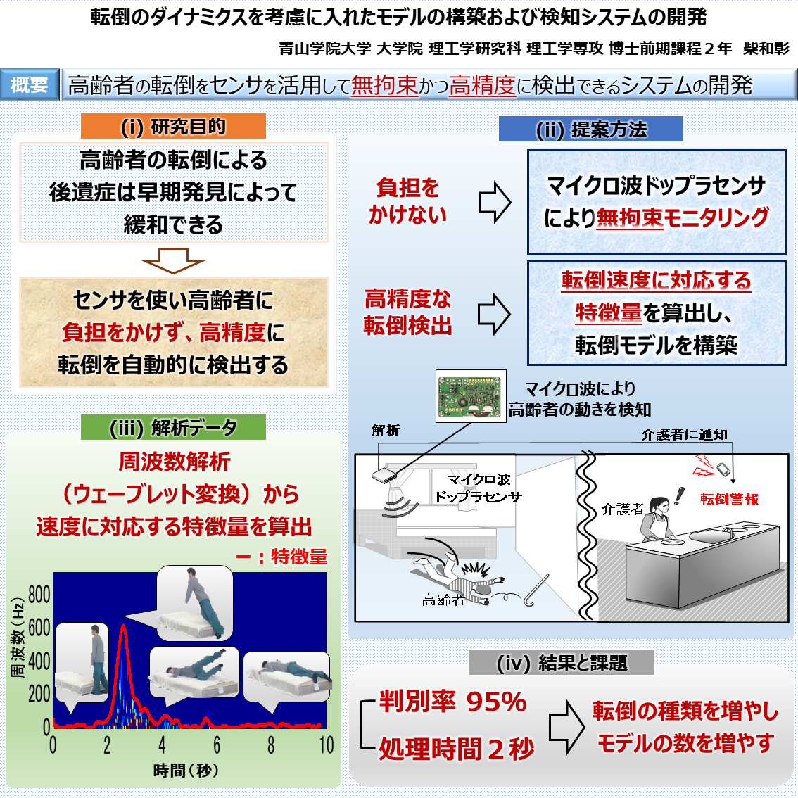 海外の文献でも、様々な日常動作の中から、転倒を判定しようとしているものもありますので、今後の課題としては、同様により多様な動作の中から、高精度に転倒を判定できるシステムの構築だと思います。